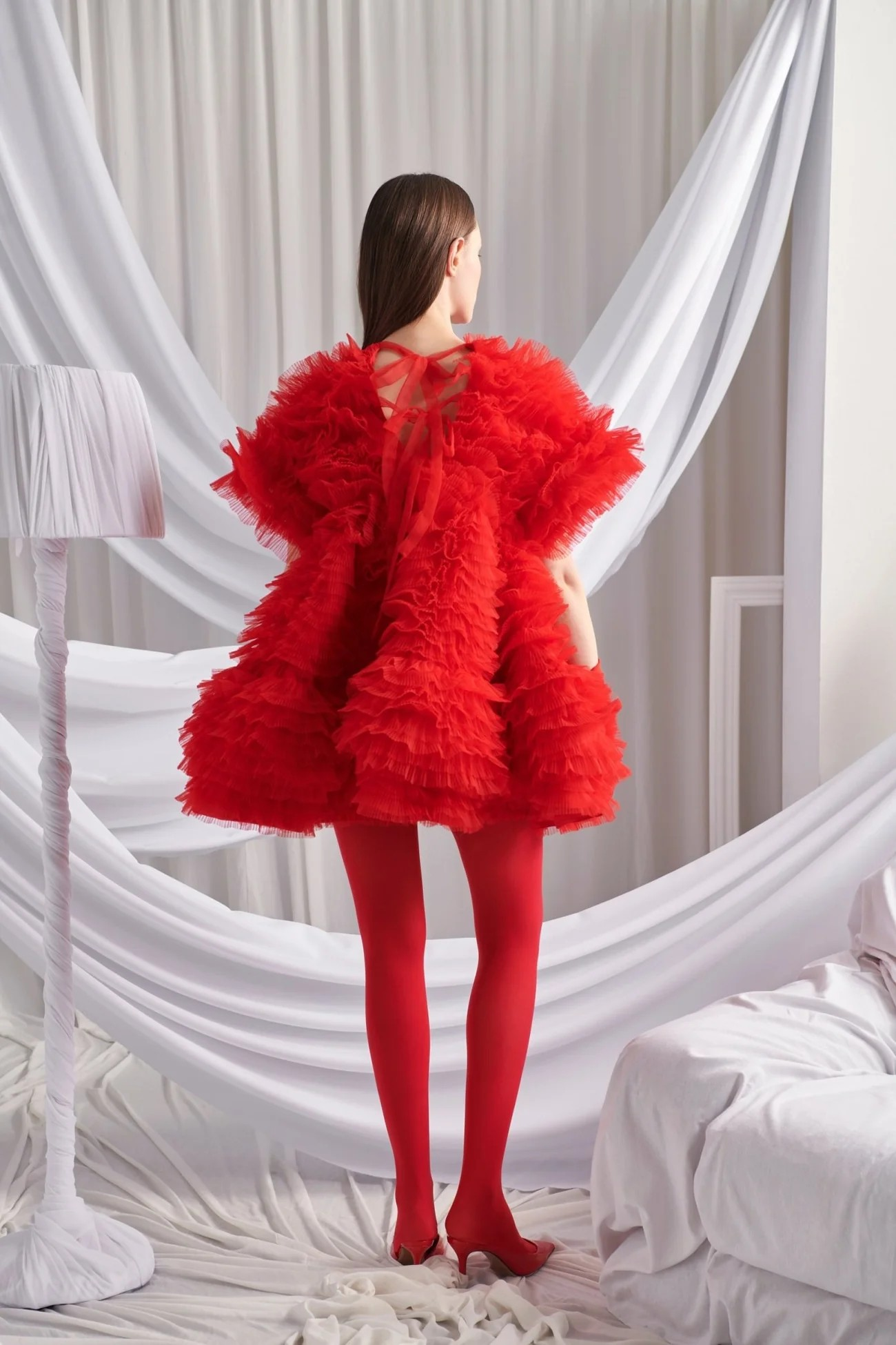 Turn heads and steal the spotlight in the Amor Dress—a playful, flirty, and utterly unique statement piece. Designed with multiple layers of airy tulle, this short red dress brings volume and movement, making every step feel like a twirl-worthy moment. The short sleeves with volume add a touch of charm.