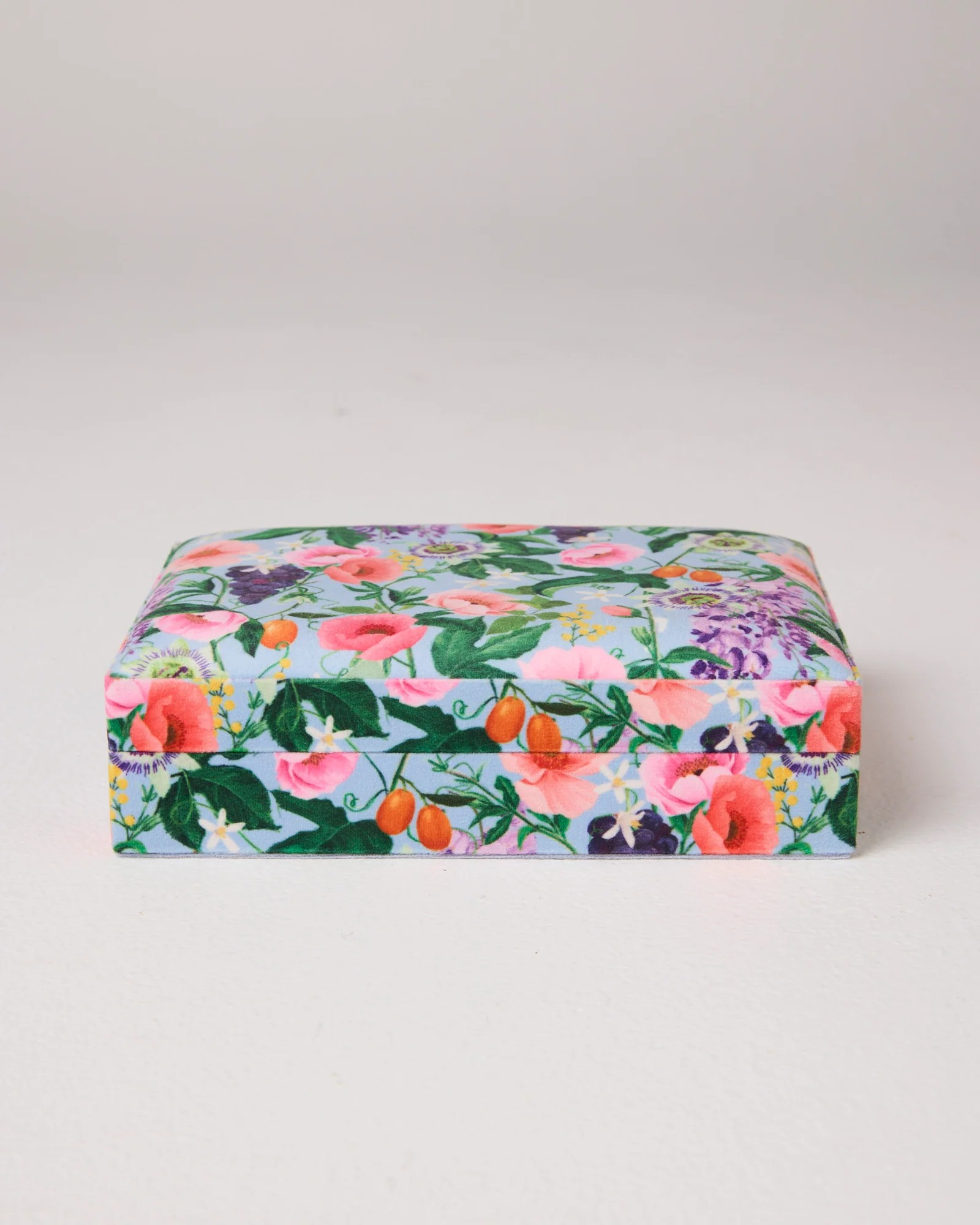 Pretty, practical, and perfectly sized! The Spring In The Air Velvet Jewellery Box Small is covered in soft blue velvet, adorned with a stunning mix of springtime florals and fresh fruits, and lined with a matching pale blue interior. It’s a little pocket of floral charm to store your cherished treasures. With three small compartments and one long section, this jewellery box is perfect for rings, earrings, chain-link pieces, and other fine jewellery, all your favourite little bits kept safe and sound.