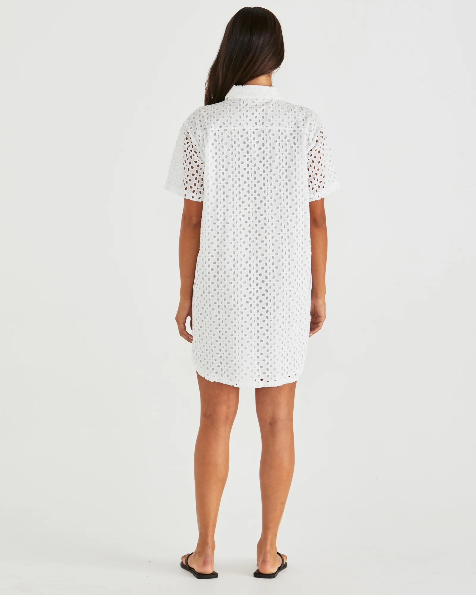 This one does it all. The Steva Shirt Dress has soft broderie, a curved hem, and concealed buttons for a polished finish. Lined where it counts and ready for summer.