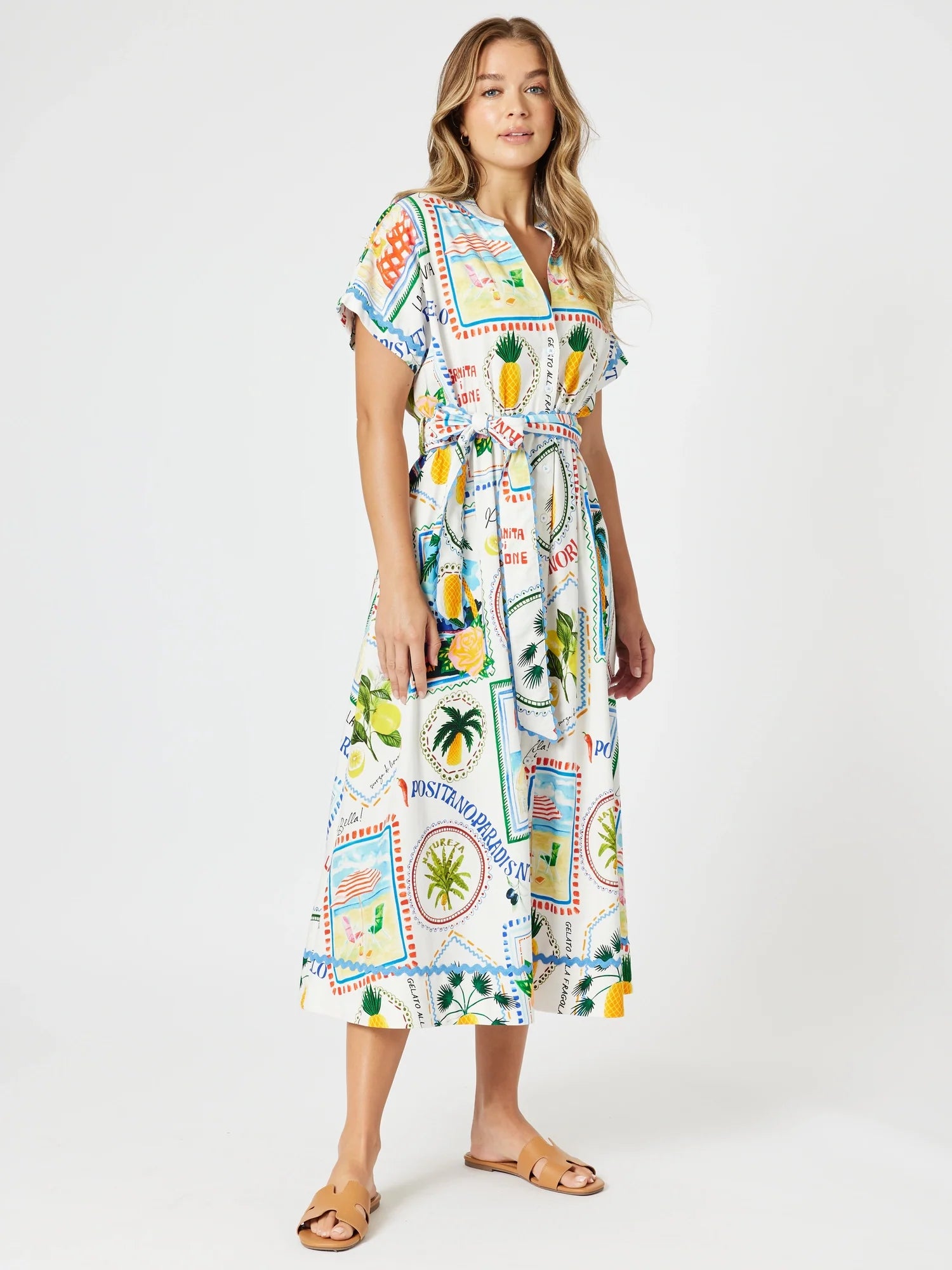 Bring the spirit of the Italian coastline to your wardrobe with The Amalfi Print Dress. Featuring a vibrant Amalfi Coast–inspired postcard print, this dress celebrates sunny days with playful motifs of limes, palm trees, and seaside scenes. Made from lightweight fabric, it features a button-through bodice, and a detachable waist tie for shaping. Short sleeves and a flowing midi-length skirt add ease and movement, while side pockets provide everyday practicality. Perfect for vacations, lunches, or weekend outings, it’s a joyful ode to la dolce vita.